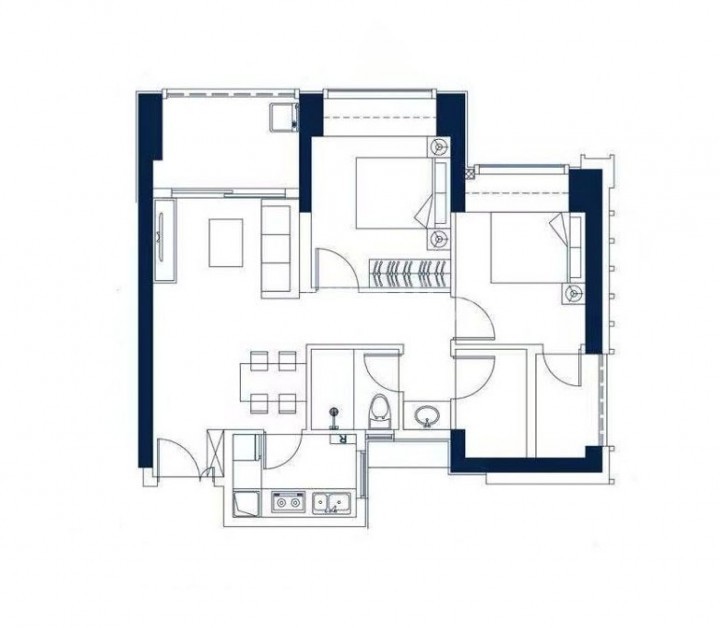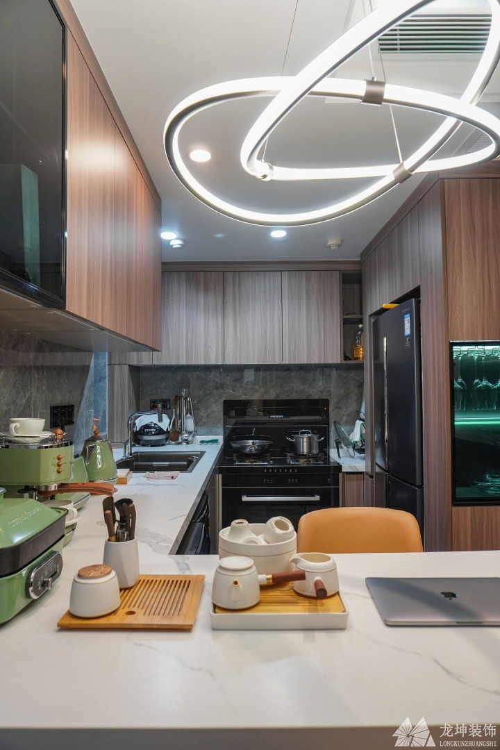 厨房、餐厅一体,岛台下方为储物空间,弥补了橱柜下方,电器占用空间而导致的储物不足。