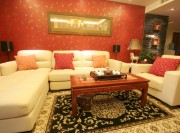 大红的背景墙,白色的沙发和古典风的茶几,使整个客厅显得十分大器。