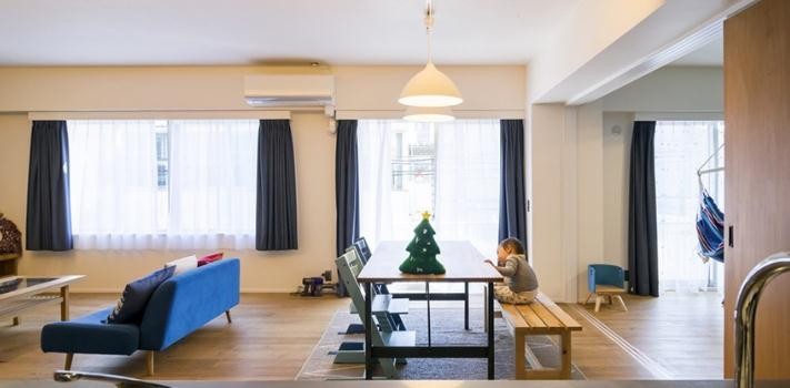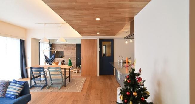 开放式 LDK (客厅、餐厅、厨房)可以让孩子们尽情地奔跑,餐桌后方平时开放的儿童游戏区,使用隐藏式拉门,待不久将来小朋友长大需要独立房间时,可灵活转换房间功能。