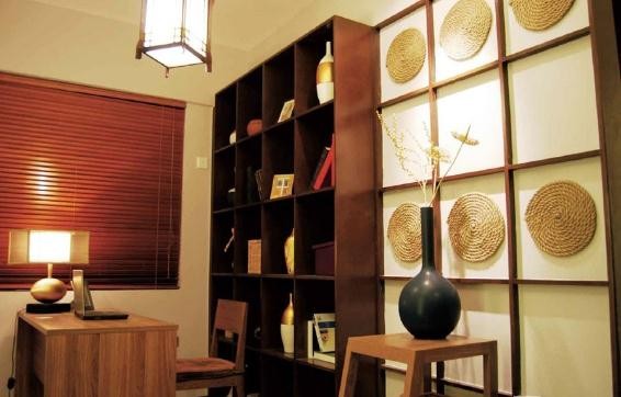 这套小户型采用夏天荷塘装修设计,墙上绿色的荷叶衬托着夏季少有的凉爽,红色的百叶窗以及黄色的背景墙有一种中式特有的简约。