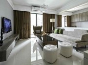 造型沙发成为了视线中的视觉中心,绒布沙发与皮质座椅对比搭配,柔和温馨。餐厅区域两边都设置了收纳柜,满足了一家三口的起居需求。